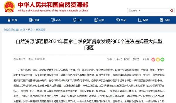 8月21日,自然資源部官網(wǎng)發(fā)布《自然資源部通報2024年國家自然資源督察發(fā)現的80個(gè)違法違規重大典型問(wèn)題》,通報表示,2024年國家自然資源督察機構聚焦耕地保護和生態(tài)保護兩條主線(xiàn)